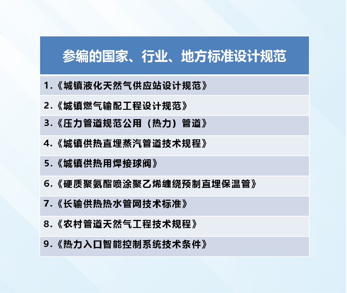 我公司參與編制了國家標(biāo)準(zhǔn)《城鎮(zhèn)液化天然氣供應(yīng)站設(shè)計規(guī)范》、《城鎮(zhèn)燃?xì)廨斉涔こ淘O(shè)計規(guī)范》、《壓力管道規(guī)范 公用管道(熱力)》、《城鎮(zhèn)供熱直埋蒸汽管道技術(shù)規(guī)程》、《城鎮(zhèn)供熱用焊接球閥》、《硬質(zhì)聚氨酯噴涂聚乙烯纏繞預(yù)制直埋保溫管》工作。其中為《壓力管道規(guī)范 公用管道(熱力)》編制起到主要作用。
