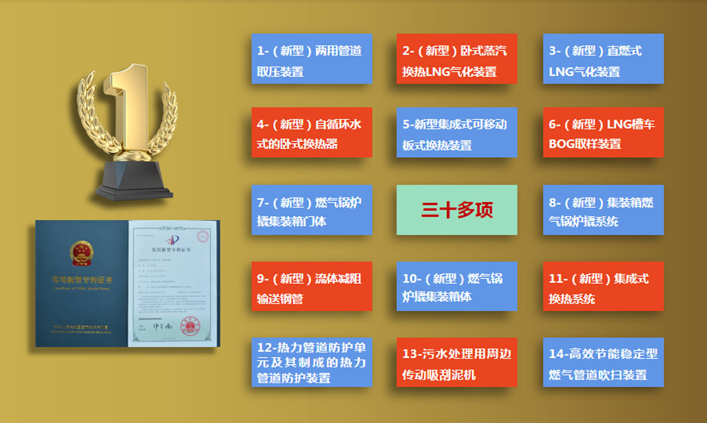 公司技術(shù)骨干編寫的專利,已申請并獲批了“兩用管道取壓裝置”(專利號ZL 2018 2 0240323.1)、“臥式蒸汽換熱LNG氣化裝置”(專利號ZL 2018 2 0226469.0),“直燃式LNG氣化裝置”等三十多項發(fā)明型和實用型專利。