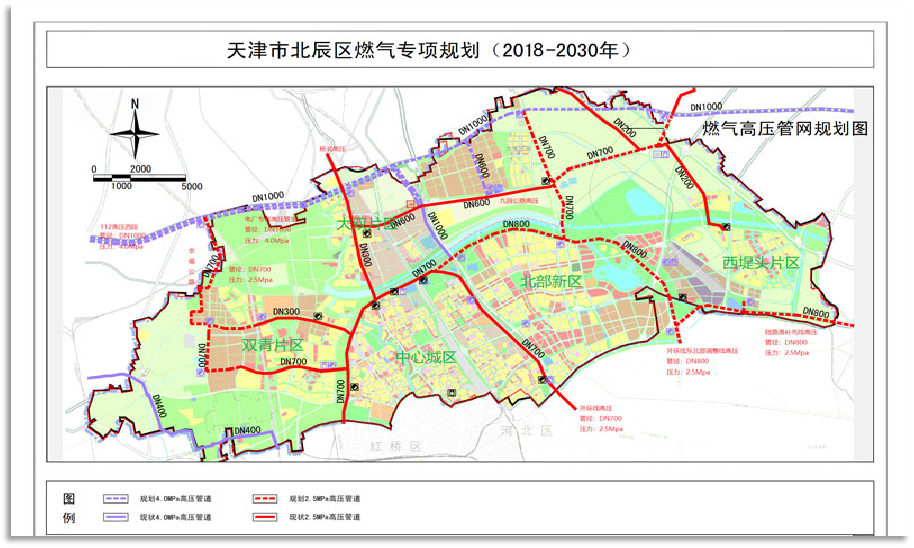 燃?xì)庖?guī)劃:規(guī)劃高中壓調(diào)壓站16座,高壓管線(DN1000)41km,次高壓管線(DN700-DN800)46km,中壓管線(DN300-DN700)60km。